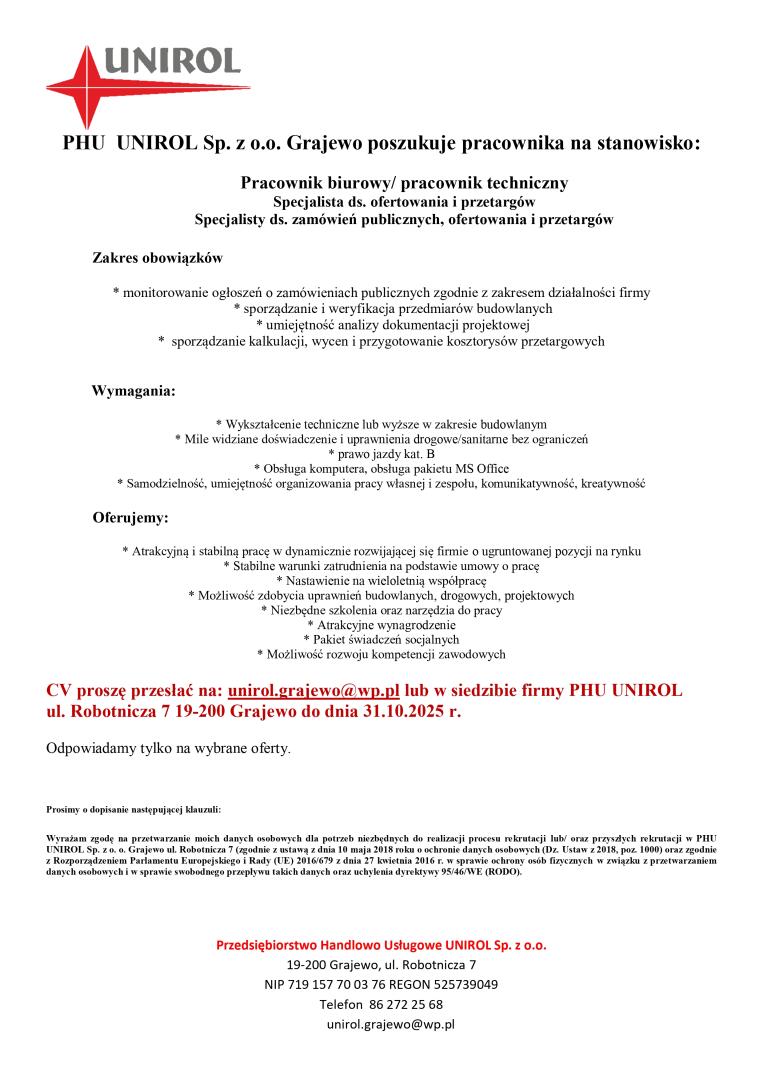 CV proszę przesłać na: unirol.grajewo@wp.pl lub w siedzibie firmy PHU UNIROL